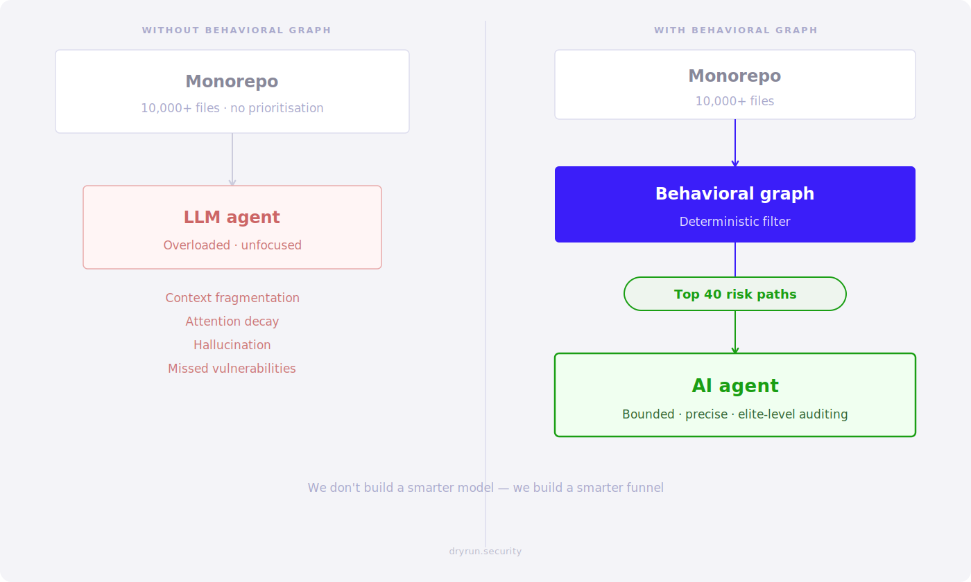 This is crucial because Large Language Models are inherently stochastic engines. If deployed naively against a massive codebase, they suffer from context fragmentation, attention decay, and hallucination. By pre-processing the repository into this behavioral artifact, we fundamentally alter the agent's execution model. We use deterministic, mathematically rigorous algorithms to tightly bound the search space. Only then do we unleash the LLM's stochastic reasoning to evaluate the semantics within that bounded space.