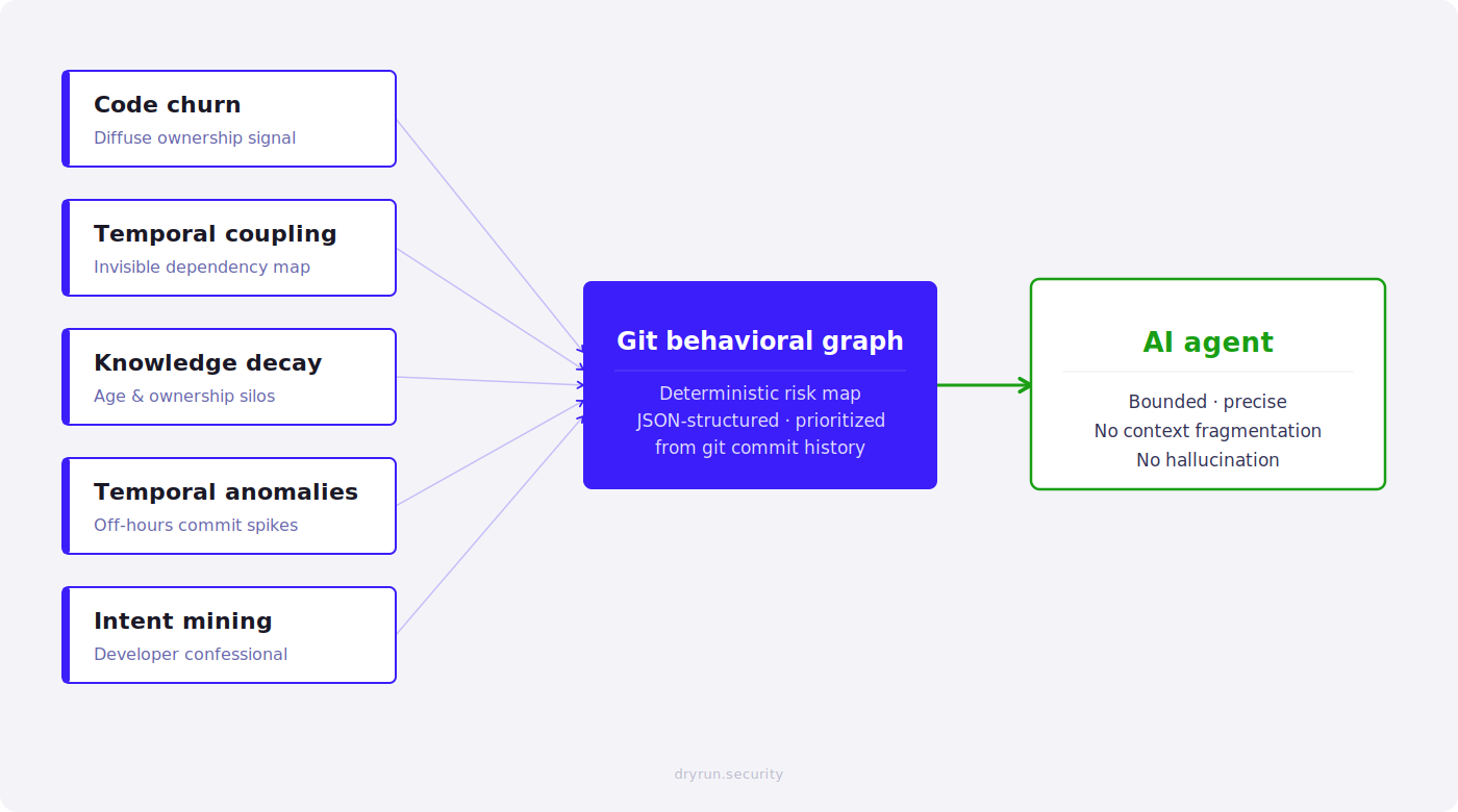 A seasoned human security auditor does not read a monorepo linearly from main.py. They operate on heuristics and intuition: they check git blame on the cryptographic wrappers, they look for the auth module everyone hot-patches but nobody actually owns, and they zero in on the files littered with "TODO: fix bypass later" comments. By building this Git Behavioral Graph, we are explicitly digitizing and scaling that human intuition into a deterministic data structure. [Tornhill, Your Code as a Crime Scene, 2nd ed. the core thesis: applying forensic psychology to treat git history as behavioral evidence]