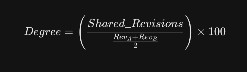 We model this as a bipartite graph of commits to files. To calculate the coupling degree, we look at the ratio of shared revisions to the average individual revision count of the pair: